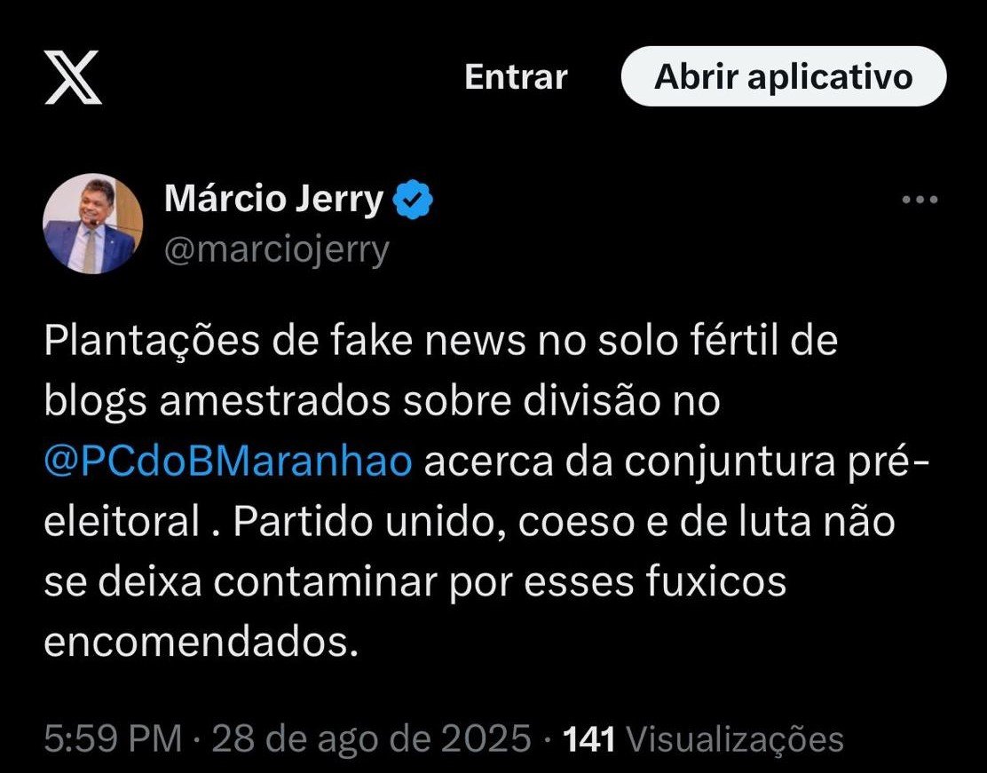 Jerry, em postagem nas redes sociais nesta última quinta-feira, 28, rebateu: “Plantações de fake news no solo fértil de blogs amestrados sobre divisão no @PCdoBMaranhao acerca da conjuntura pré-eleitoral . Partido unido, coeso e de luta não se deixa contaminar por esses fuxicos encomendados”.